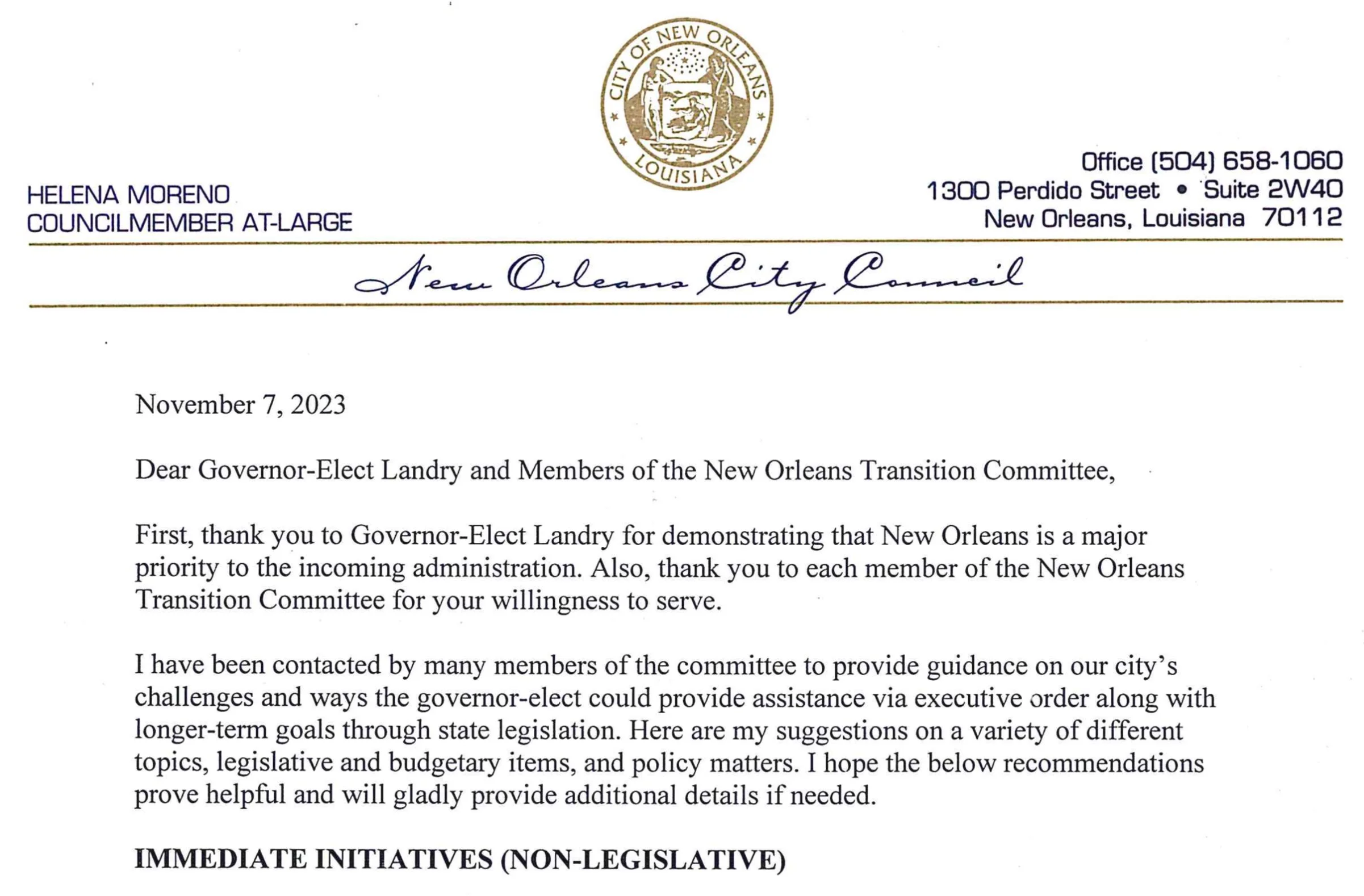 Letter to Governor Elect Landry and New Orleans Transition Committee